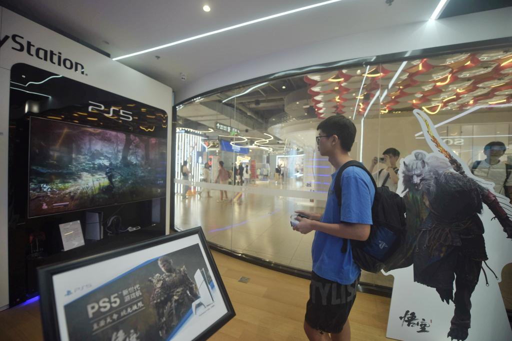 2024年8月20日,游戏爱好者在杭州一家索尼门店通过游戏机体验游戏《黑神话:悟空》。新华社发(龙巍摄)